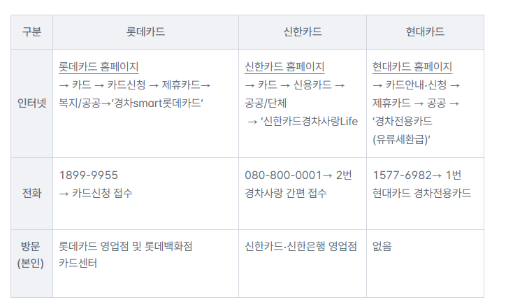 유류세 환급을 받기 위해서는 지정된 카드사에서 발급한 전용 카드를 사용해야 하며, 카드사별로 다양한 추가 혜택이 제공됩니다. 아래를 참고하여 나에게 맞는 카드를 선택해 보세요.
