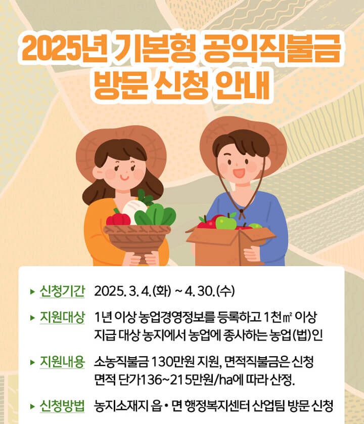 2025년 기본형 공익직불금은 온라인과 오프라인 두 가지 방법으로 신청할 수 있습니다.